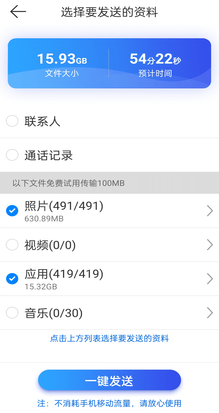 照片、视频、app安装包、音乐、通讯录、通话记录,都可以传输,只需要链接到无线局域网,包括手机热点都可以快速传输,不需要流量